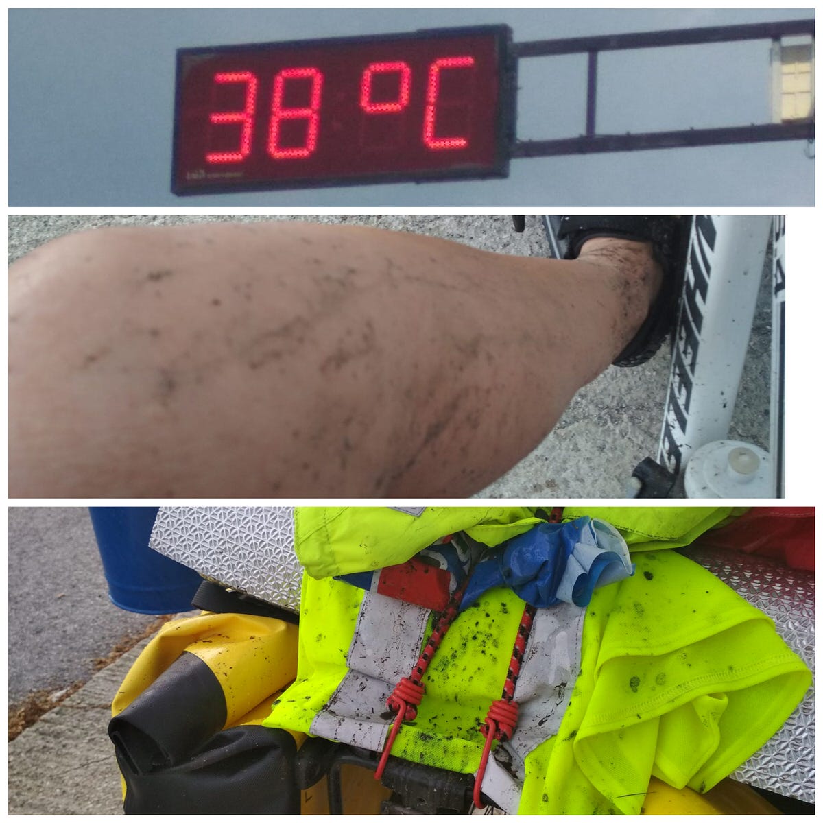 Dan je peklensko vroč. Pokazatelji tempereture ob poti kažejo 38° celzija. Kot da bi vozila po Španiji, ne pa po Slovaškem. Oblaki se grdo zbirajo na kup in kmalu so tu prve škraplje dežja, pa tudi obilno deževje. Vožnja po asfaltiranih, nekoliko načetih cestah (imenovala sem jih »putrce«, saj so spominjale na raztopljeno maslo ;-), je pustila sledove na nogah in opremi.